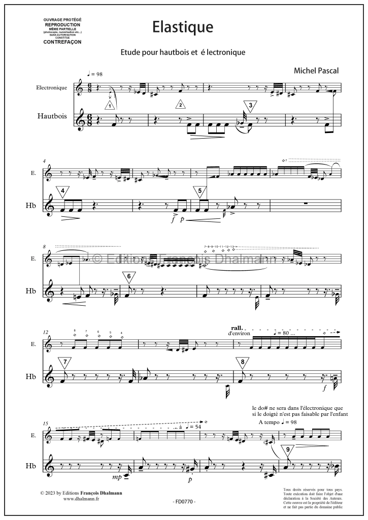 Etude pour hautbois et électronique pour le cycle 1. Les notes du hautbois lancent de petites figures rythmiques au tempo précis, mais en réponse, l’électronique semble à la fois les tendre et les détendre, jouant de son côté à l’élastique. Ces courtes études, faciles et agréables à jouer, pour instrument solo et électronique ont été conçues en collaboration avec des professeurs d’instrument en conservatoire pour de jeunes élèves en fin de cycle 1 ou en cycle 2. Elles ont pour objectif de familiariser les jeunes instrumentistes à la fois avec les sons électroniques, quelques techniques inhabituelles de leur instrument, courantes dans le domaine de la musique contemporaine, et la lecture d’une partie électronique notée strictement de manière conventionnelle. Piste audio d’accompagnement avec les sons électronique en téléchargement : TELECHARGER Partition disponible au format imprimé ou en téléchargement immédiat.