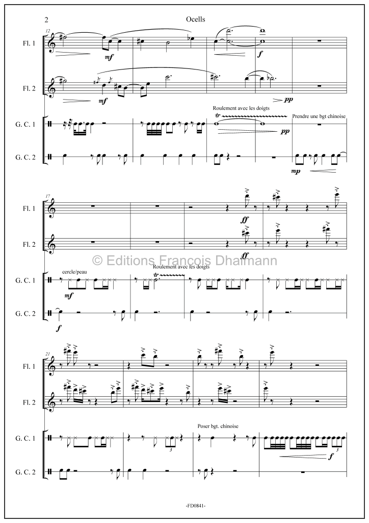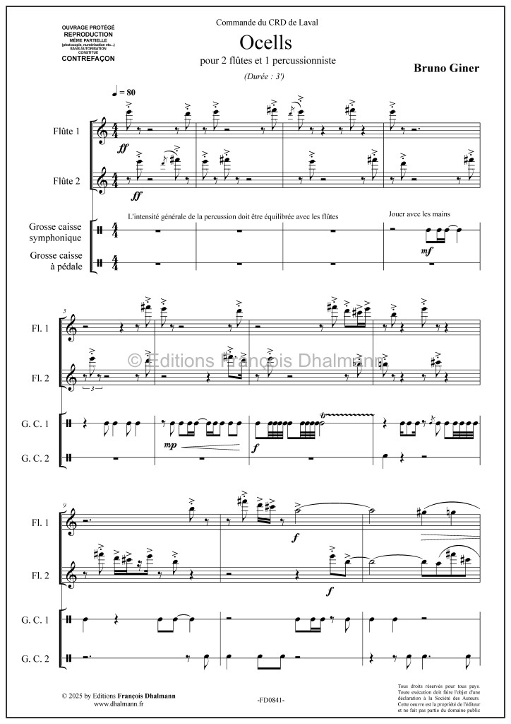 Ocells means “birds” in Catalan. This short trio, intended for intermediate students, is conceived and designed as a duet. The same instrument is systematically doubled: two flutes (one entity) dialogue with two bass drums (another entity). This permanent duality is expressed on musical, technical, and symbolic levels: high/low; striated time/smooth time; hiccup/counterpoint; foot/hand; hand/stick; sky/earth; aerial/deep, and so on.
