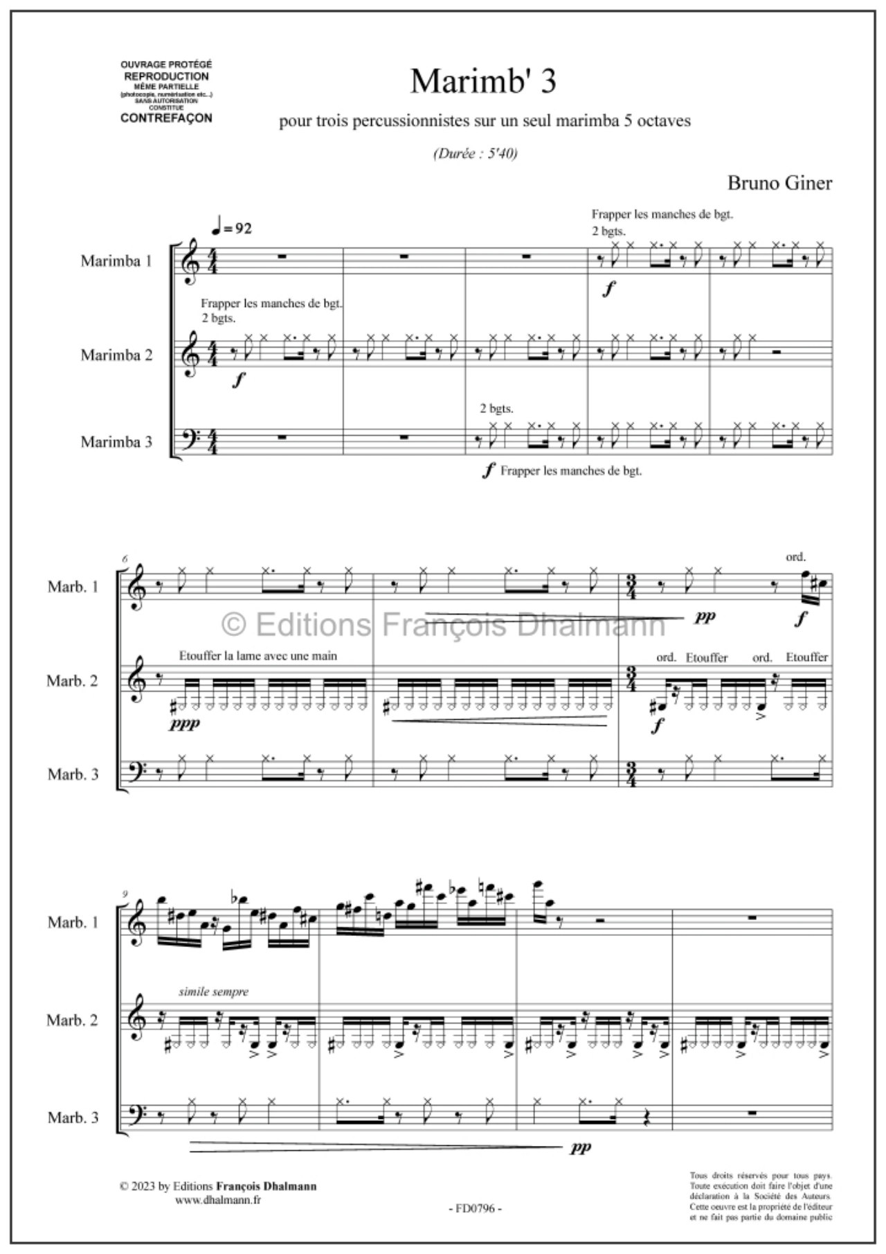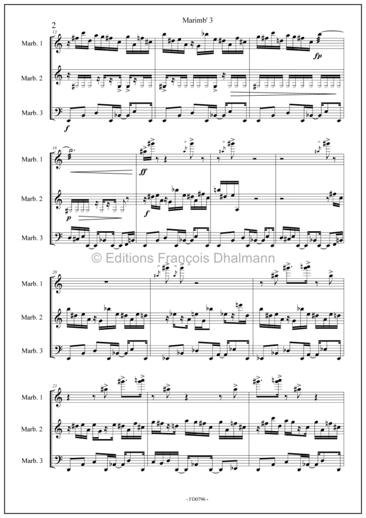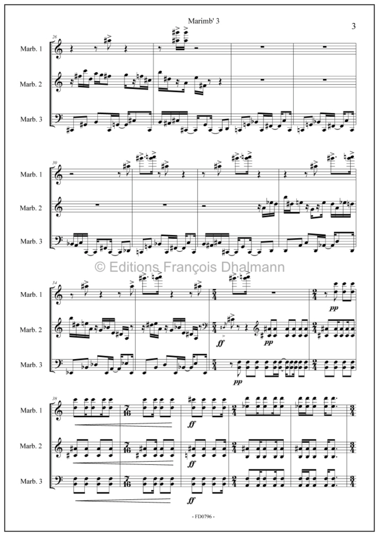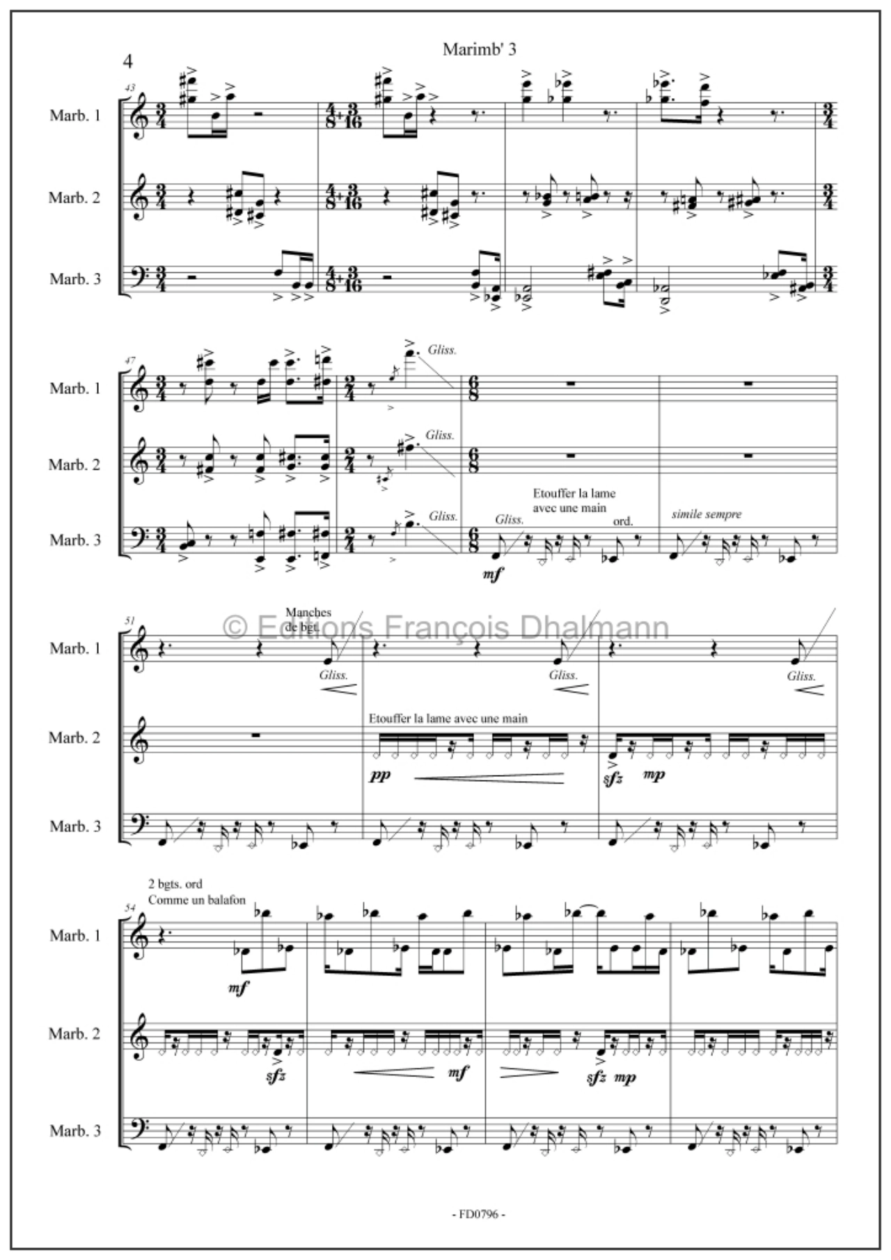 Pièce pour trois percussionnistes jouant sur le même marimba.