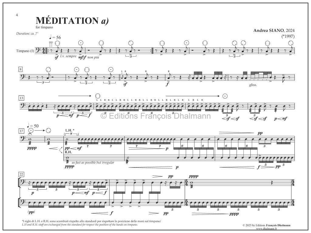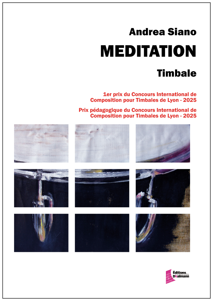 L’idée centrale de la composition est de participer à un moment méditatif et rituel, caractérisé par les gestes lents des sections d’ouverture et de clôture, communes aux trois œuvres. Des symboles spécifiques indiquent les points exacts de la peau à frapper. Grâce aux propriétés acoustiques de l’instrument, différents timbres peuvent être perçus en fonction du point de frappe, permettant ainsi d’obtenir une sorte de « synthèse » entre le geste performatif et la couleur sonore. Les références aux cultures orientales sont évidentes (comme la pratique du taiko japonais). Le titre « Méditation » fait référence non seulement à un état psychique, mais aussi à un espace temporel dilaté dédié à la réflexion. Pour cette pièce particulière, il n’y a pas de préparatifs ni d’instruments supplémentaires (à l’exception de l’utilisation de la super balle) : l’objectif de la composition est d’élargir les possibilités timbrales et techniques de l’instrument à travers quelques gestes simples.