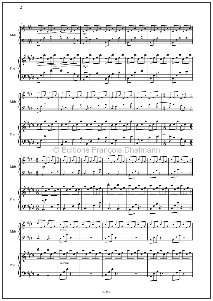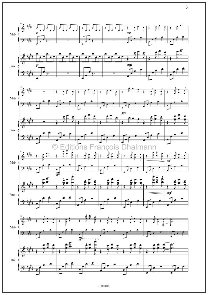 La résonance chaude du marimba flotte sans effort au-dessus de la base harmonique du piano, invitant les interprètes à tisser un dialogue gracieux et fluide entre les deux instruments.