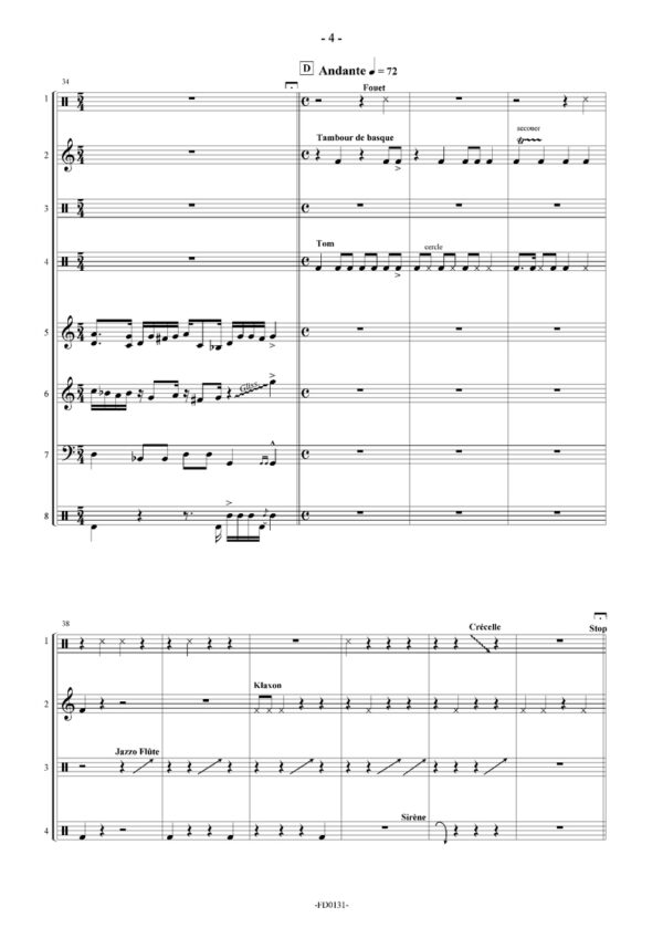 Instrumentarium : 1 Marimba ; 1 Vibraphone ; 1 Glockenspiel ; 1 Batterie ; 4 Timbales ; 1 Tam ; 1 Tom grave ; Tambour de basque ; Triangle ; Klaxon ; Fouet ; Crécelle ; Jazzo Flûte ; Sirène.