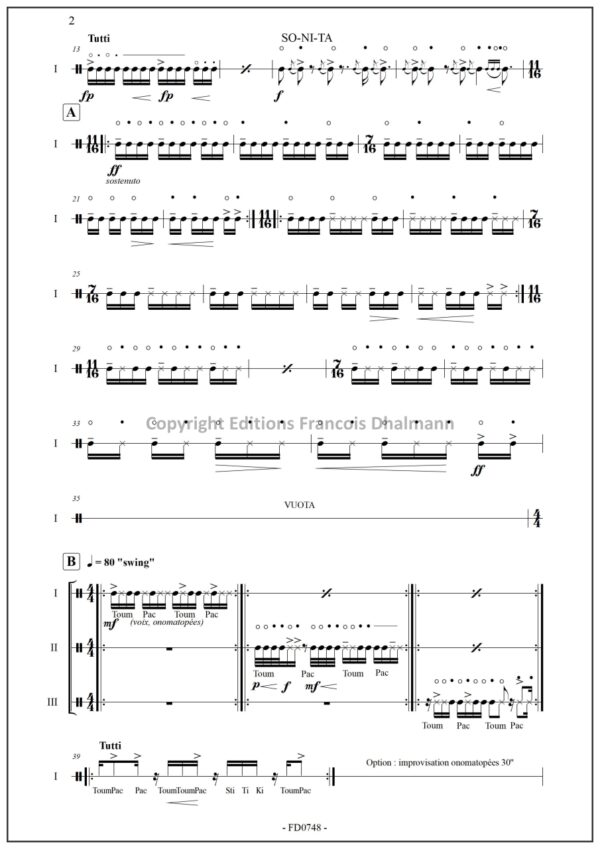 Partition pour trio de percussion jouant sur une grosse caisse (ou trois toms).