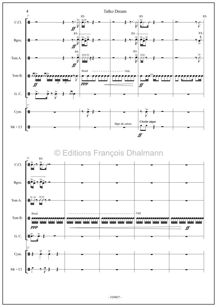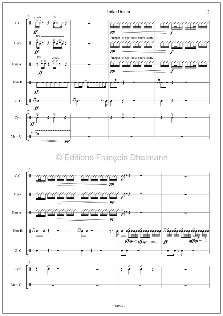 Pièce pour ensemble de percussion dirigé (minimum 7/8 percussionnistes). Les parties peuvent être doublées, triplées de manière à jouer en grand ensemble, à la condition de préserver les équilibres requis par la musique.