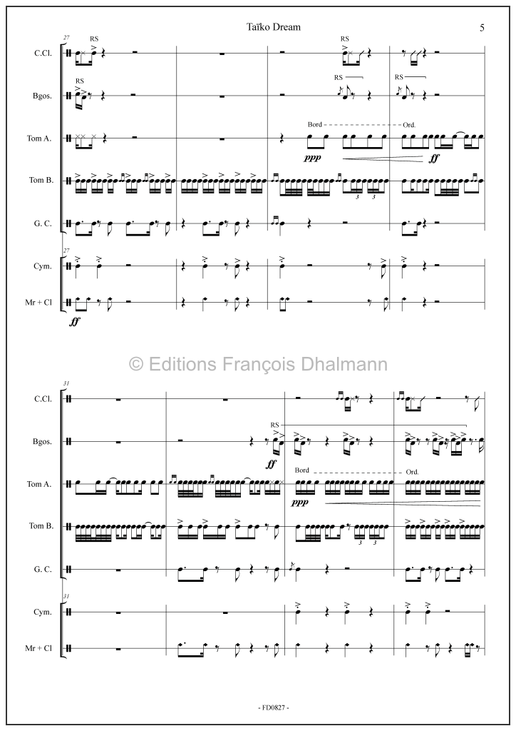 Cette pièce d’ensemble est une sorte de métissage entre la tradition des tambours japonais (d’où le titre) et celle de la batucada (d’où les cloches par exemple).