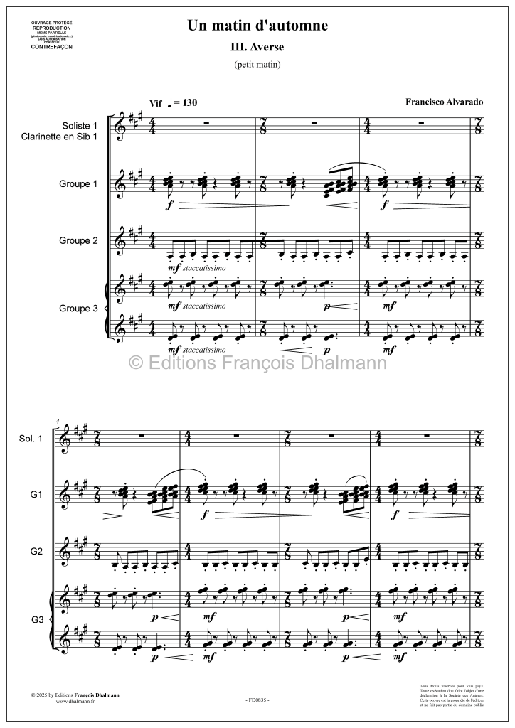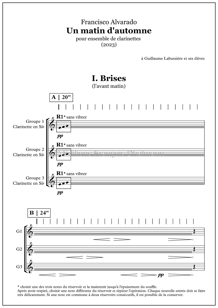 Pièce multi-niveau pour grand ensemble de clarinettes en trois mouvements : Brises, Rosée, Averse.