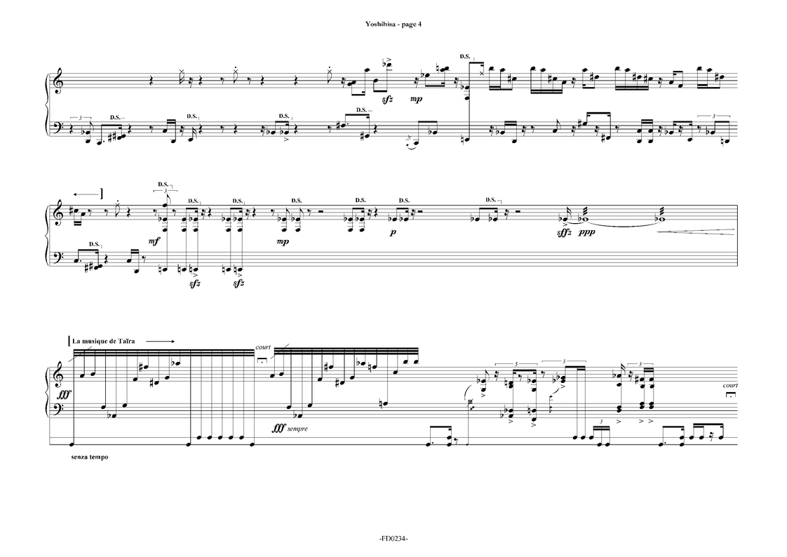 Yoshihisa (in memoriam), pour marimba 5 octaves, est (on l’aura compris) un hommage à Yoshihisa Taïra, libre dérive imaginaire et spéculative basée sur quelques notes de sa « grande soeur » Convergence.